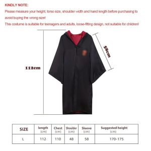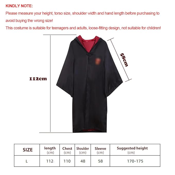 - AUTHENTIC ROBE DESIGN: Step into the magical world of Hogwarts with the meticulously crafted House of Gryffindor costume set. This premium robe measures 112cm in length and is designed with a bust of 110cm, shoulder width of 48cm, and sleeve length of 58cm, making it an ideal fit for adults with a height of 170-175cm. The robe replicates the iconic Gryffindor attire seen in the Harry Potter films, down to the finest detail, ensuring you look the part at any wizarding event.