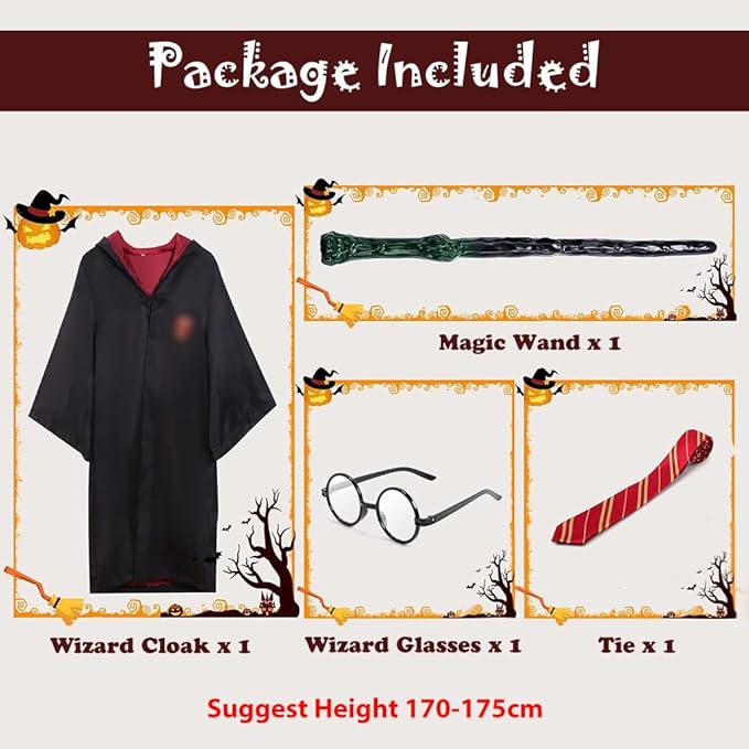 - SET OF 4PCS HARRY POTTER GRYFFINDOR COSTUME: Embrace your inner wizard with this comprehensive Gryffindor costume set, which includes a one-piece Gryffindor robe, a classic striped tie, a character-authentic wand, and Harry Potter’s signature round glasses. This ensemble equips you with all the essentials to embody a Gryffindor student, making it perfect for immersive cosplay experiences or themed parties.